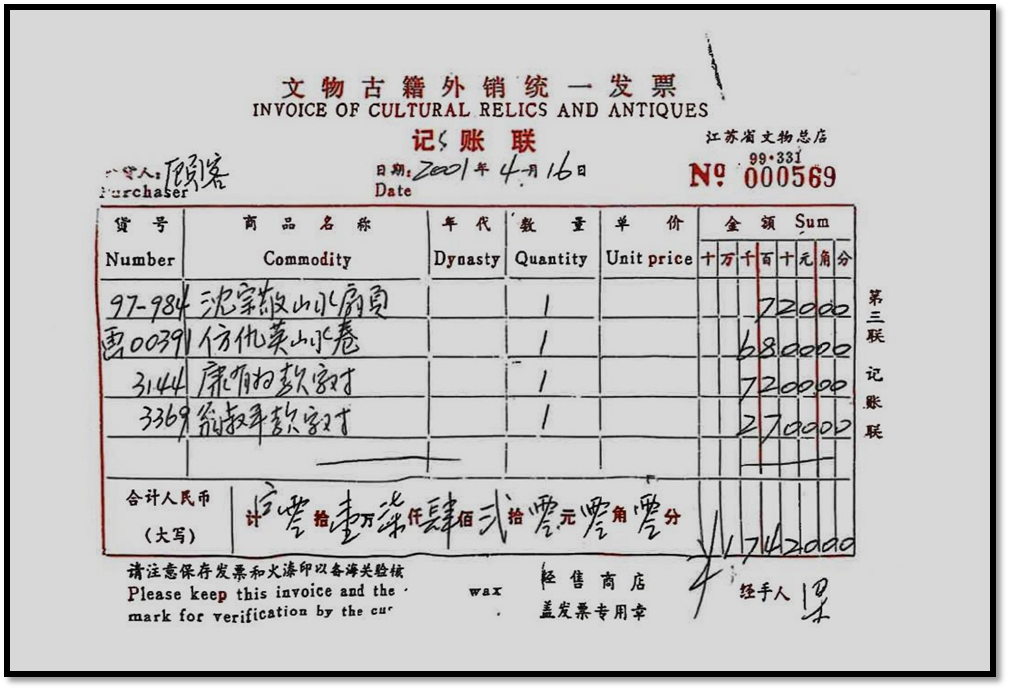 三问:“处置”方式是否合法合规?这样的“处置”方式是否合法合规?据一位不愿具名的业内人士透露,不够馆藏标准的文物(即博物馆的处理品),一般会调剂给其他国有单位收藏,比如区县博物馆。上世纪80年代末90年代初,在倡导“以文养文,以文补文”的背景下,也有一些博物馆会将不达标的文物调剂给文物商店创收。“那个时候,文物商店是带有市场企业属性的事业单位,与博物馆为同一个系统。”从南京博物院出示的庞莱臣旧藏《江南春》从划拨、调剂、退藏,到经由原江苏省文物总店出售的记录和凭证,程序上基本是合规的。但买走这幅画作的“顾客”是谁?原江苏省文物总店销售单据上,具名“顾客”而不署实名又是为何?在当时是否合规?