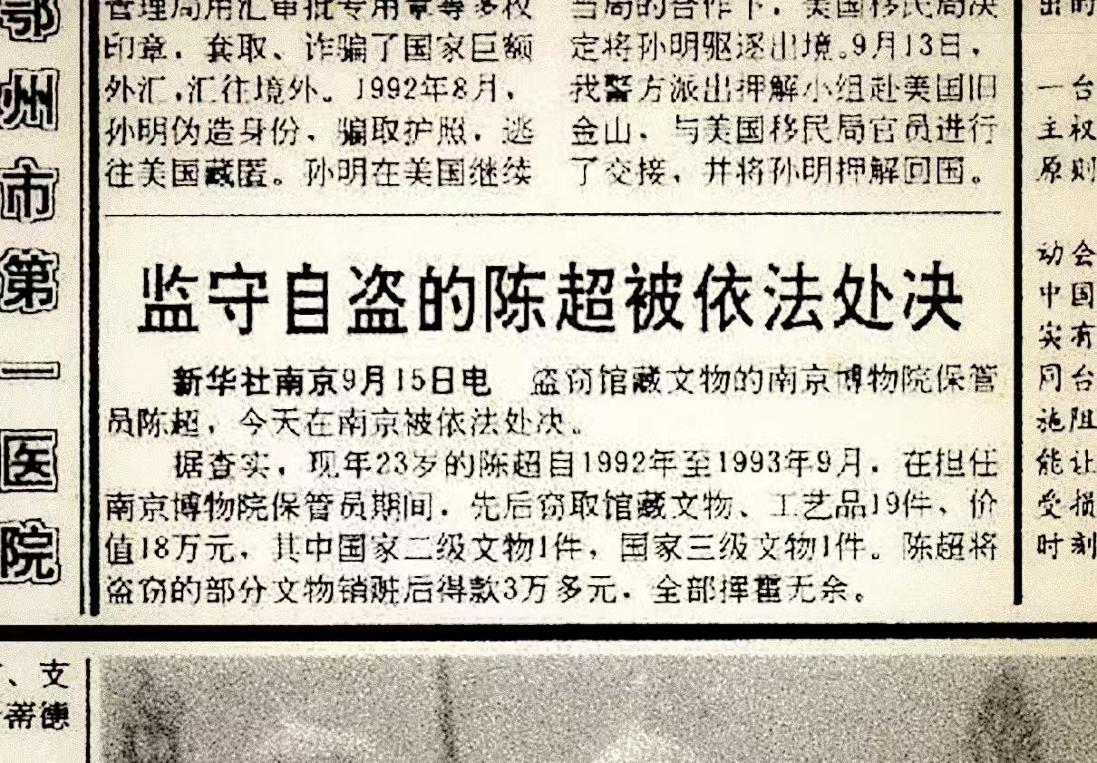 4.上世纪九十年代,南博发生文物被盗大案,南博保管员陈某监守自盗,在南京市法院审判时,陈某要立功赎罪,举报反映库房文物偷盗线索,徐院长当着审判员及本院参加庭审职工的面不让陈某讲话,法警将陈某押走,审判员直接宣判陈某死刑(冤死鬼),徐院长有保护伞(江苏省检察院韩建林院长),当年韩建林院长把职工殷某的举报信交给徐湖平,拿着举报人的举报信在全院大会点名,南博水太深黑透了!(有录音为证)
