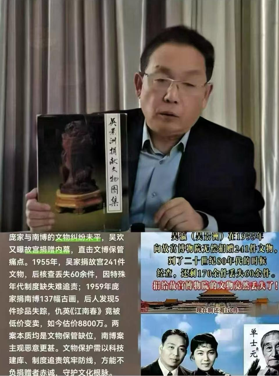 - 「就在国家文物局开始调查南博的时候,近代故宫博物院创建人之一吴瀛(吴景洲)的孙子,戏剧家吴祖光之子吴欢,爆料祖父在1955年向故當博物院无偿捐赠给故宫的241件珍品,到了二十世纪80年代的时候经查,还剩170余件,60多件凭空消失,回应只甩“制度不健全”的空话,连追索方案都拿不出。」