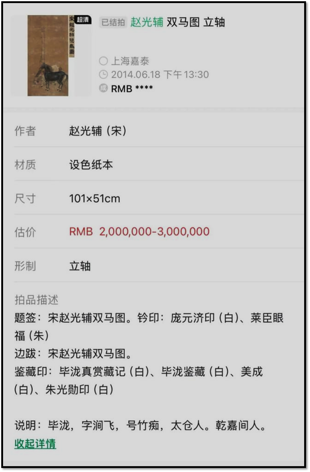 南京博物院出示了相关专家鉴定记录及有关流程证据,其中一份上世纪90年代的登记表显示,与“江南春卷”同一批被认定为“不宜入藏”的南京博物院昔日馆藏书画,还有1件“赵光辅双马轴”。尽管2014年现身拍卖会的赵光辅《双马图》,带有“庞元济印”、“莱臣眼福”的两方钤印,但目前披露的证据无法完全认定,这件2014年以230万元成交的拍品,就是庞莱臣后人无偿捐赠、后被南京博物院“调剂”处理的原品。