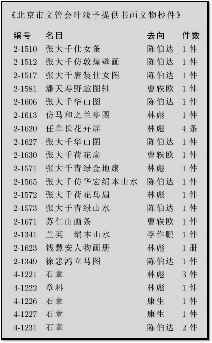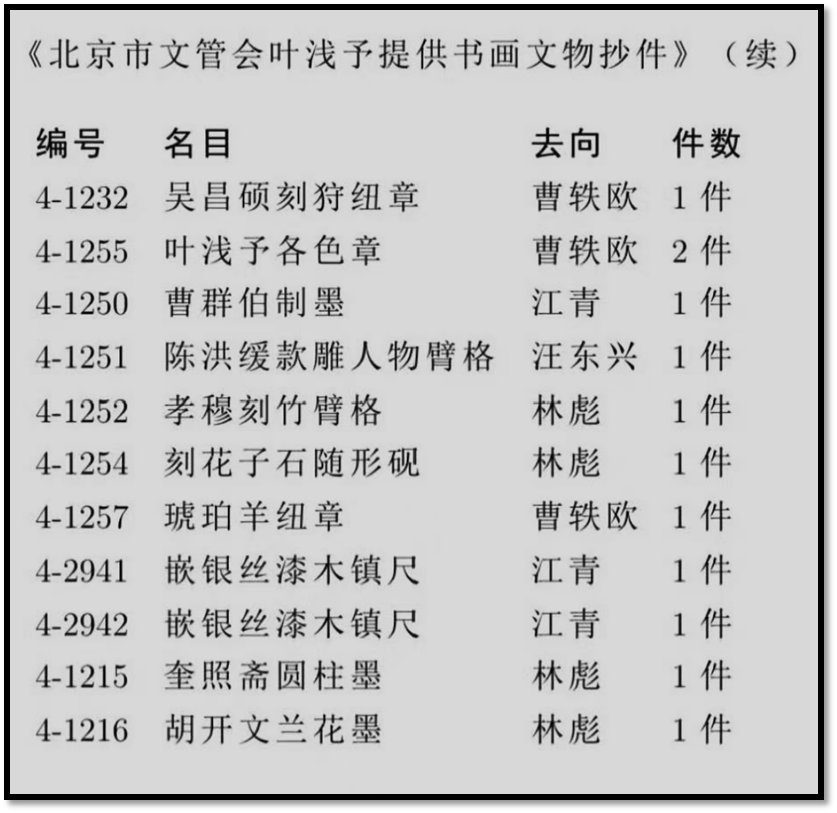 1979年美院宣布我的政治结论,撤销以前的诬蔑不实之辞,决定发还抄家物资,留在美院的那部分私产,陆续发还给我,其中书籍画件约损失20%,还算幸运。不过,其中比较重要的书画文物,由于文物局的某次命令,调归国家保管,被北京文管会调走,此时只发还了其中的一小部分,剩下三十三件,声明已在某年处理掉了,没法归还。经我调查,原来北京市文管会认为叶浅予的反革命罪行翻不了案,他的财物可以自由处理,大权在握的人,如陈伯达、康生之流,虎视眈眈,谁不想乘机捞一把,而文管会的抬轿子、拍马屁老手,乘机献媚,请这班权贵人物随意挑选,大发横财。谁知叶浅予的反革命帽子竟然摘掉了,这三十多件原属叶某之物,一时没法退还,我说这批文物到底如何处理,处理给谁,开个单子给我,注明每件的去向,我自己想办法找回来。北京文管会得此下台阶机会,乖乖地开了个清单给我。现将此文件清单抄录如下: