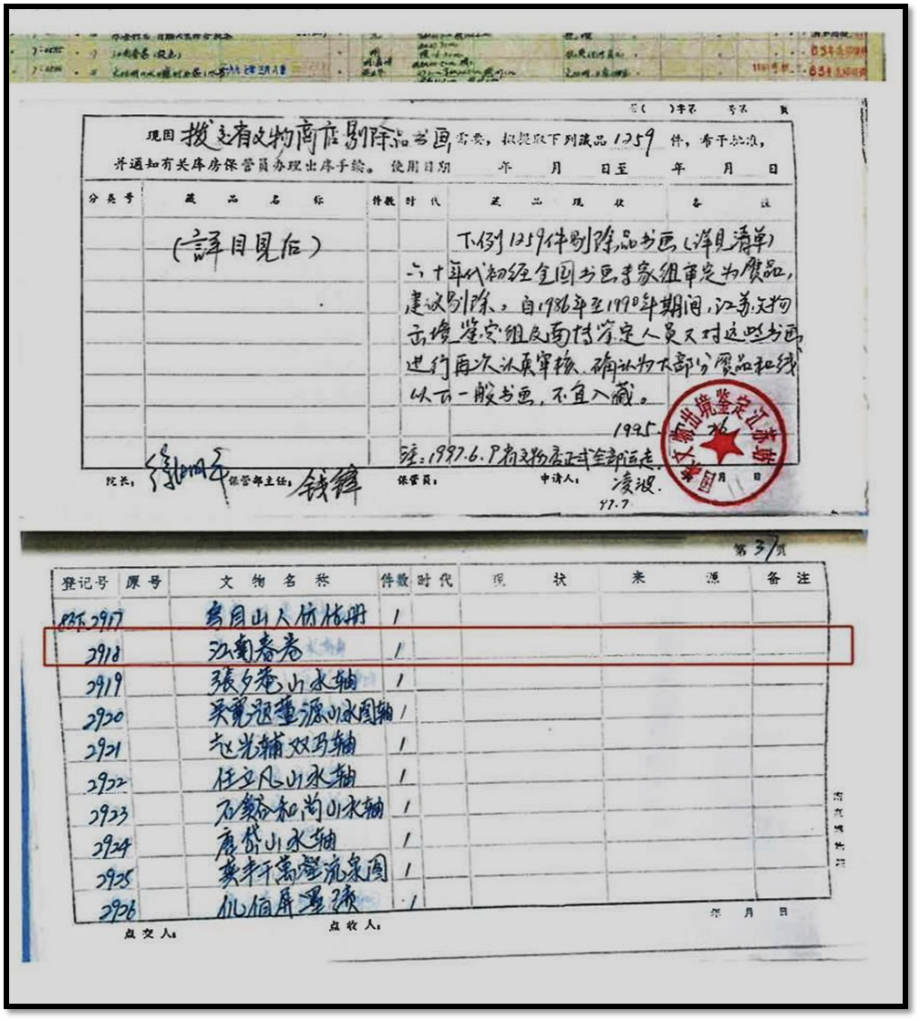 1997年4月15日,南京博物院向原江苏省文化厅提交《关于处理不够馆藏标准文物的报告》,请求“将不够馆藏标准的文物(即博物馆的处理品)进行调剂,价拨给省文物总店处理”,并于1997年4月21日同意调剂;5月8日,被专家认定为赝品的《江南春》图卷拨交给原江苏省文物总店,于2001年4月16日被“顾客”以6800元价格购买,销售清单明示为《仿仇英山水卷》。